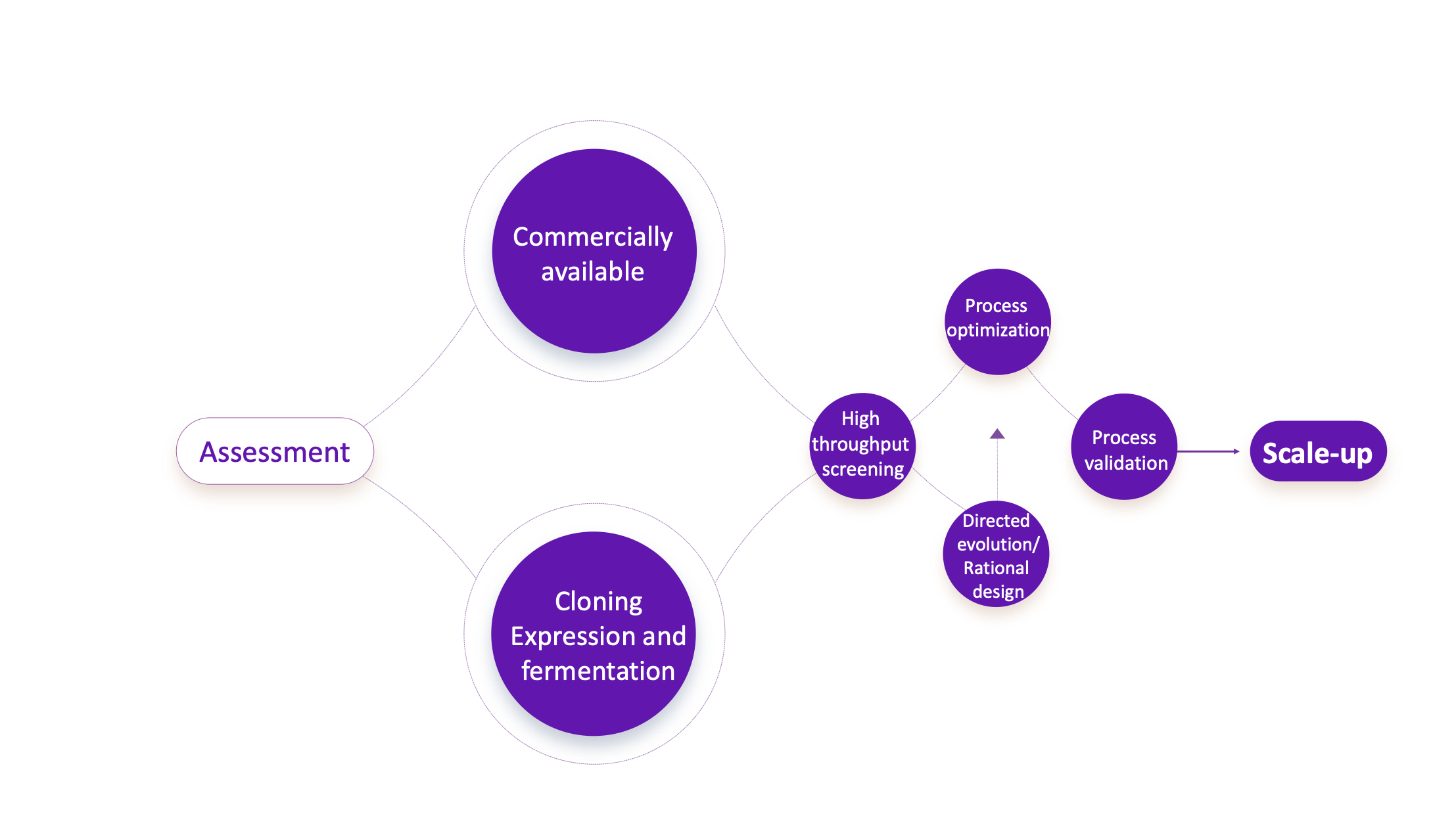 For some specific reactions, we choose target enzymes by high-throughput screening from existing enzyme libraries, and then perform process optimization in terms of relevant chirality and conversion rate to improve respective parameters for chiral swift synthesis and chiral separation based on the preliminary screening results and product target requirement.